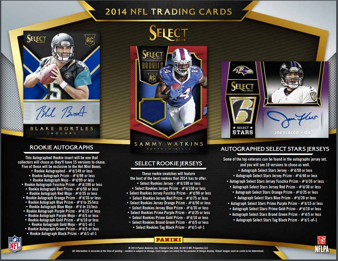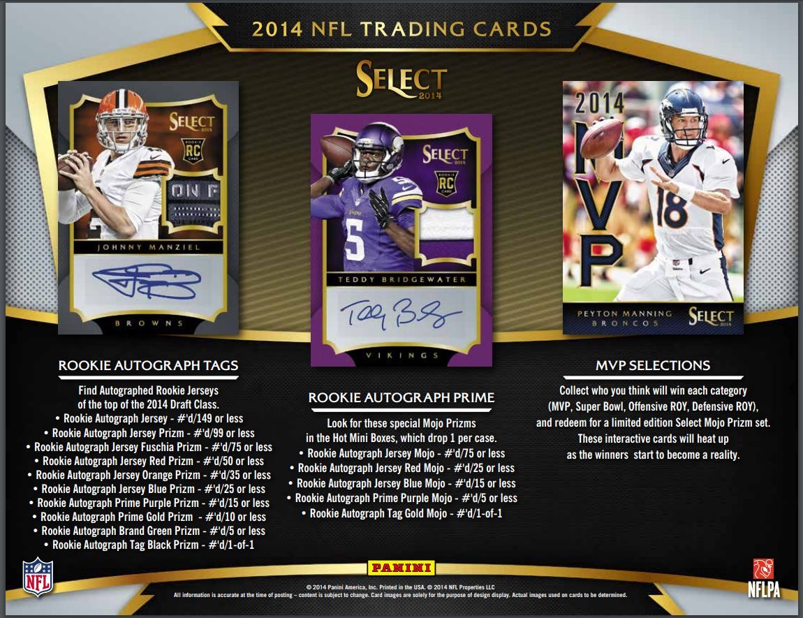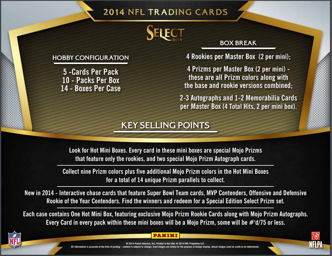 - New in 2014 - Interactive chase cards that feature Super Bowl Team cards, MVP Contenders, Offensive and Defensive Rookie of the Year Contenders. Find the winners and redeem for a Special Edition Select Prizm set.