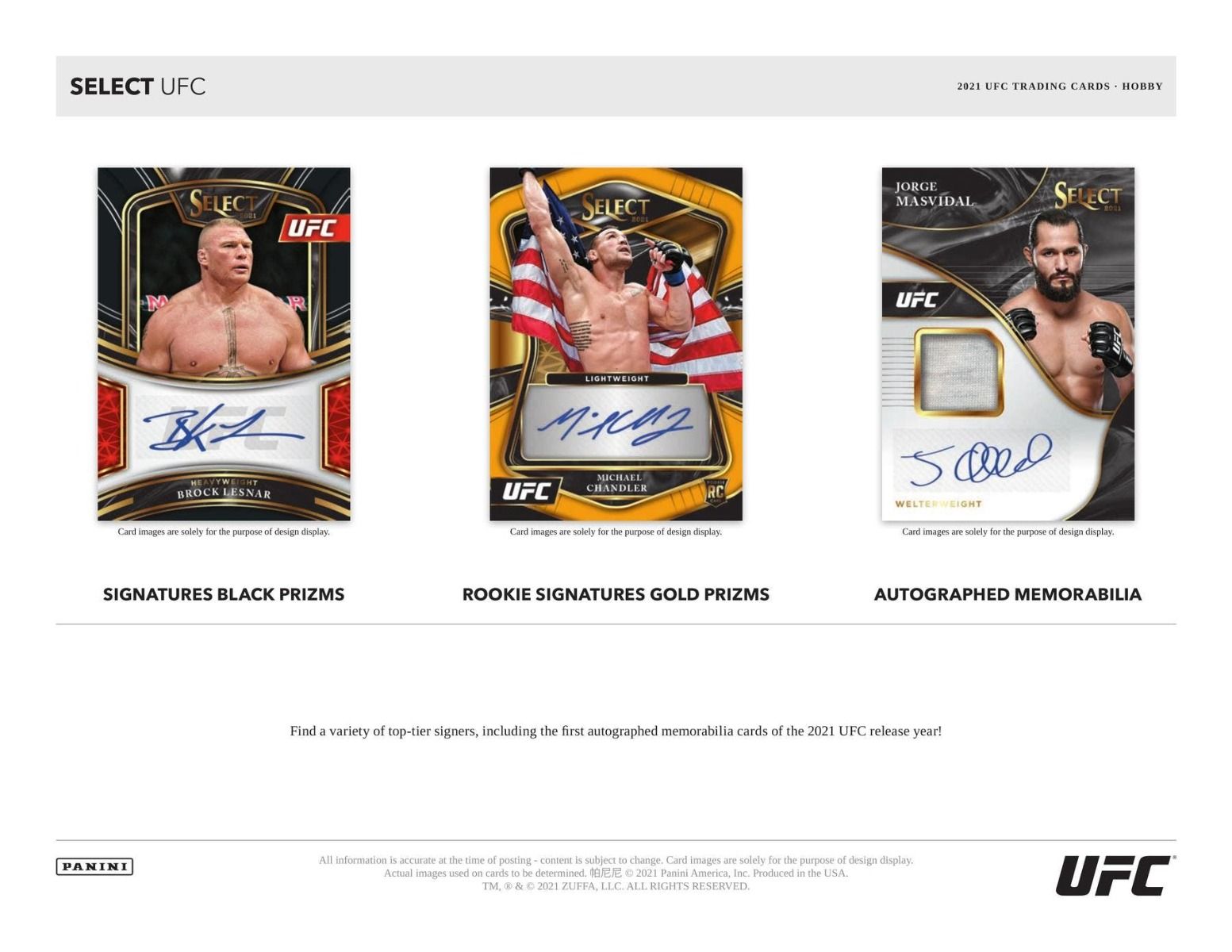 SIGNATURES BLACK PRIZMS/ROOKIE SIGNATURES GOLD PRIZMS/AUTOGRAPHED MEMORABILIA:Â Find a variety of top-tier signers, including the first autographed memorabilia cards of the 2021 UFC release year!