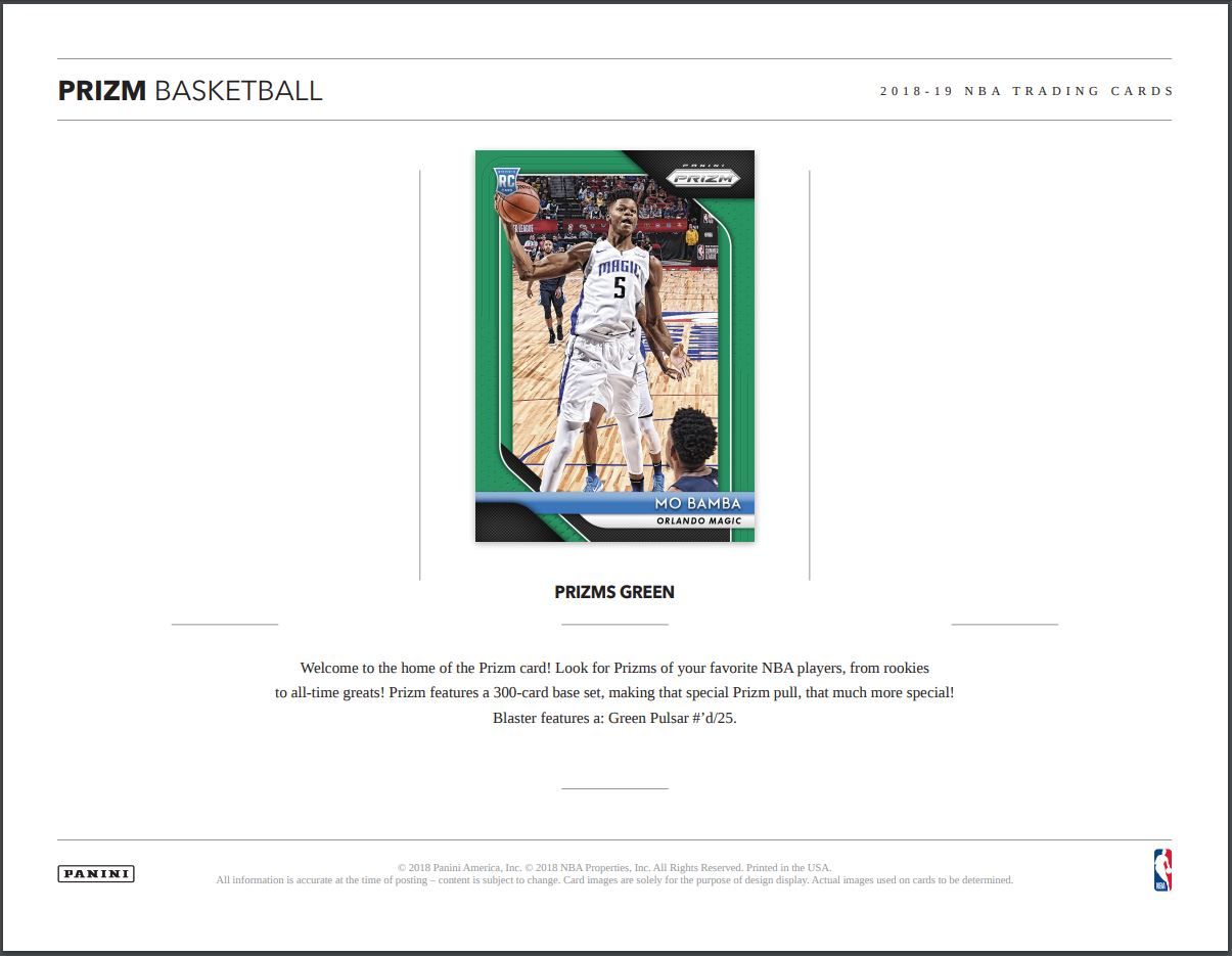 PRIZMS GREEN:Â Welcome to the home of the Prizm card! Look for Prizms of your favorite NBA players, from rookies to all-time greats! Prizm features a 300-card base set, making that special Prizm pull, that much more special! Blaster features a: Green Pulsar #'d/25.