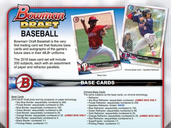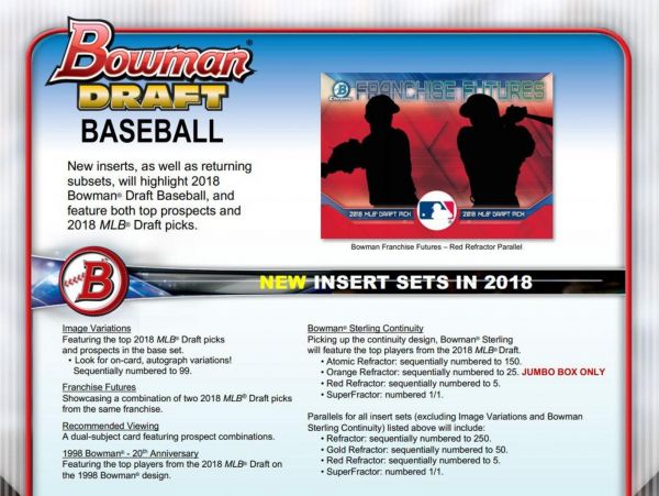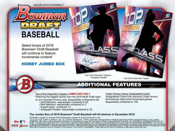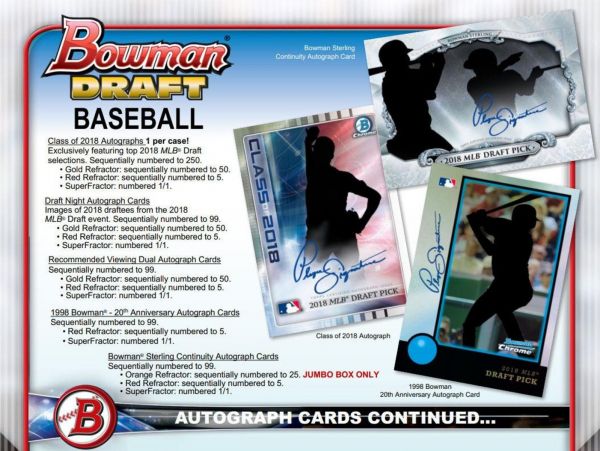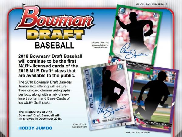 - The 2018 Bowman Draft Baseball Jumbo Box offering will feature three on-card chrome autographs per box, along with a mix of new insert content and Base Cards of top MLB Draft picks.