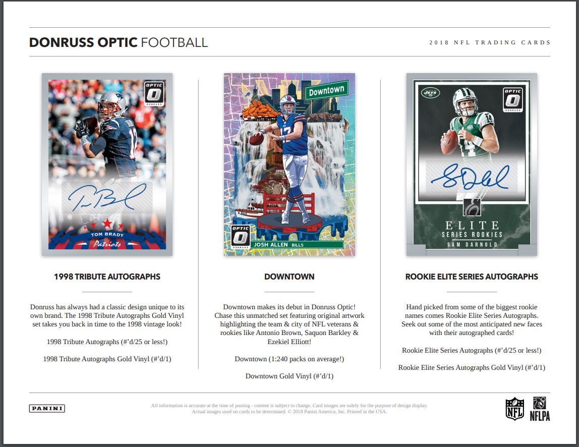 Downtown makes its debut in Donruss Optic! Chase this unmatched set featuring original artwork highlighting the team & city of NFL veterans & rookies like Antonio Brown, Saquon Barkley & Ezekiel Elliott!