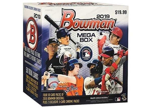 - Each 2019 Bowman Mega Box has six packs. Four have 2019 Bowman Baseball cards while the other two are exclusive Chrome Mega Box cards.