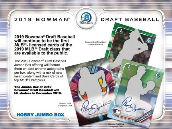 - In addition to Three Autographs, the 2019 Bowman Draft Baseball Hobby Jumbo Box features a mix of new insert content and Base Cards of top MLB Draft picks.