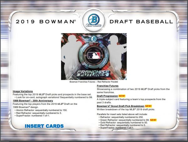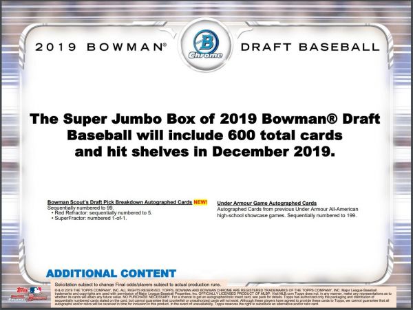 Each Jumbo Box of 2019 Bowman Draft will contain three autograph cards, while each case will deliver at least 1 Class of 2019 Autograph case hit!