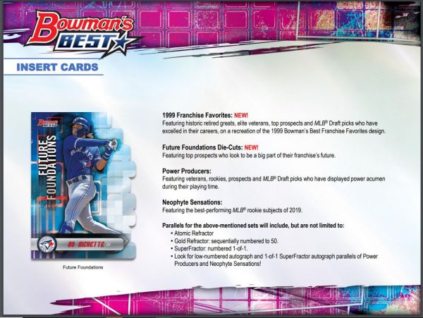 Featuring historic retired greats, elite veterans, top prospects and MLB® Draft picks who have excelled in their careers, on a recreation of the 1999 Bowman’s Best Franchise Favorites design.