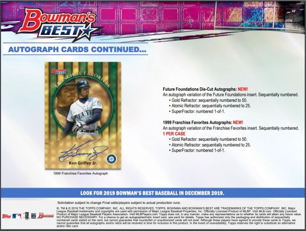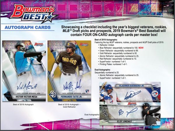Showcasing a checklist including the year’s biggest veterans, rookies, MLB Draft picks and prospects, 2019 Bowman’s Best Baseball will contain FOUR ON-CARD autograph cards per master box!