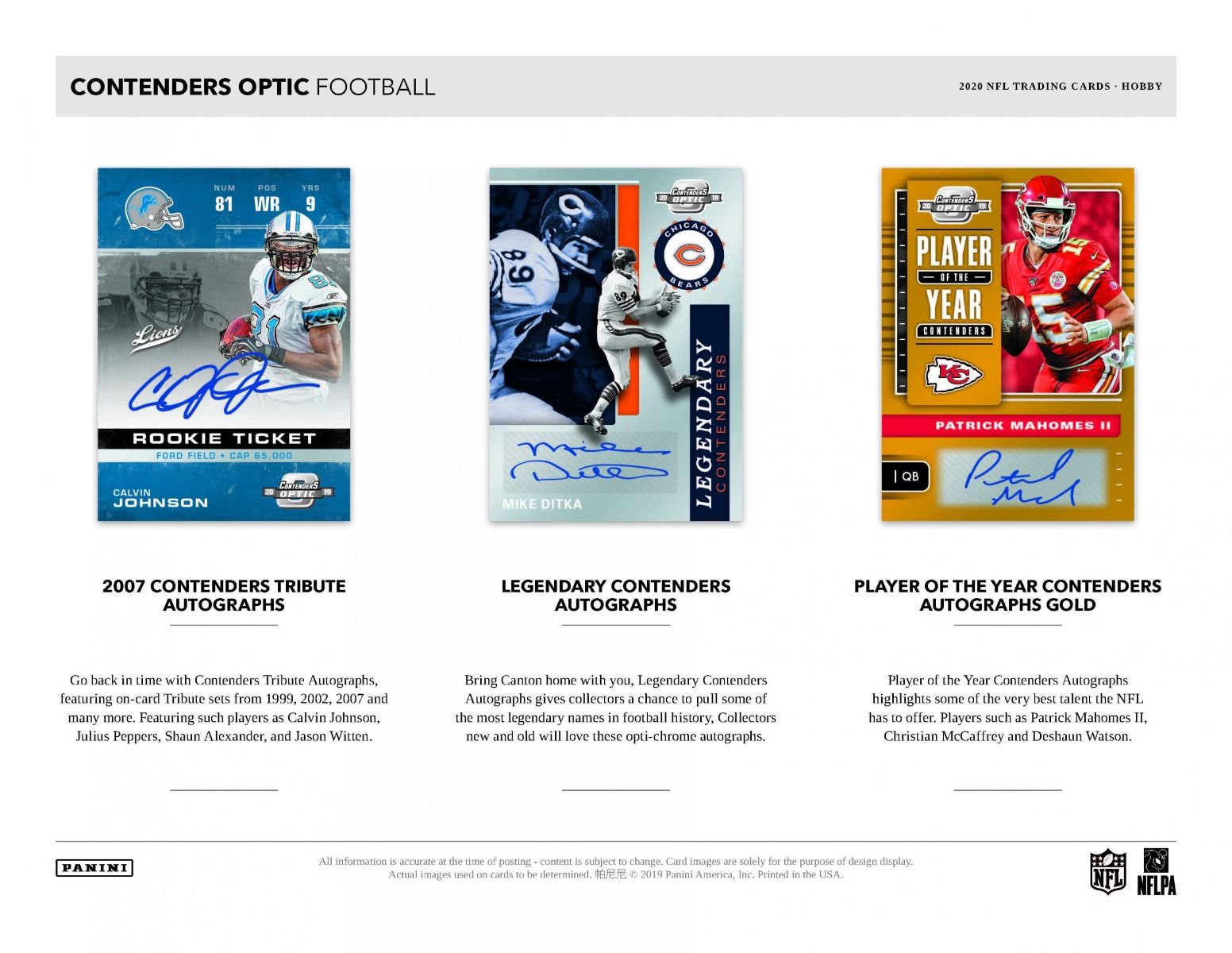 PLAYER OF THE YEAR CONTENDERS AUTOGRAPHS: Player of the Year Contenders Autographs highlights some of the very best talent the NFL has to offer. Players such as Patrick Mahomes II, Christian McCaffrey and Deshaun Watson.
