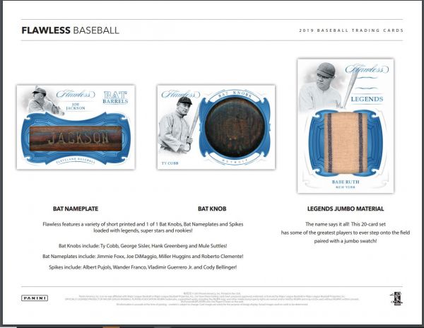 Flawless features a variety of short printed and 1 of 1 Bat Knobs, Bat Nameplates and Spikes loaded with legends, super stars and rookies! Bat Knobs include: Ty Cobb, George Sisler, Hank Greenberg and Mule Suttles! Bat Nameplates include: Jimmie Foxx, Joe DiMaggio, Miller Huggins and Roberto Clemente! Spikes include: Albert Pujols, Wander Franco, Vladimir Guerrero Jr. and Cody Bellinger!