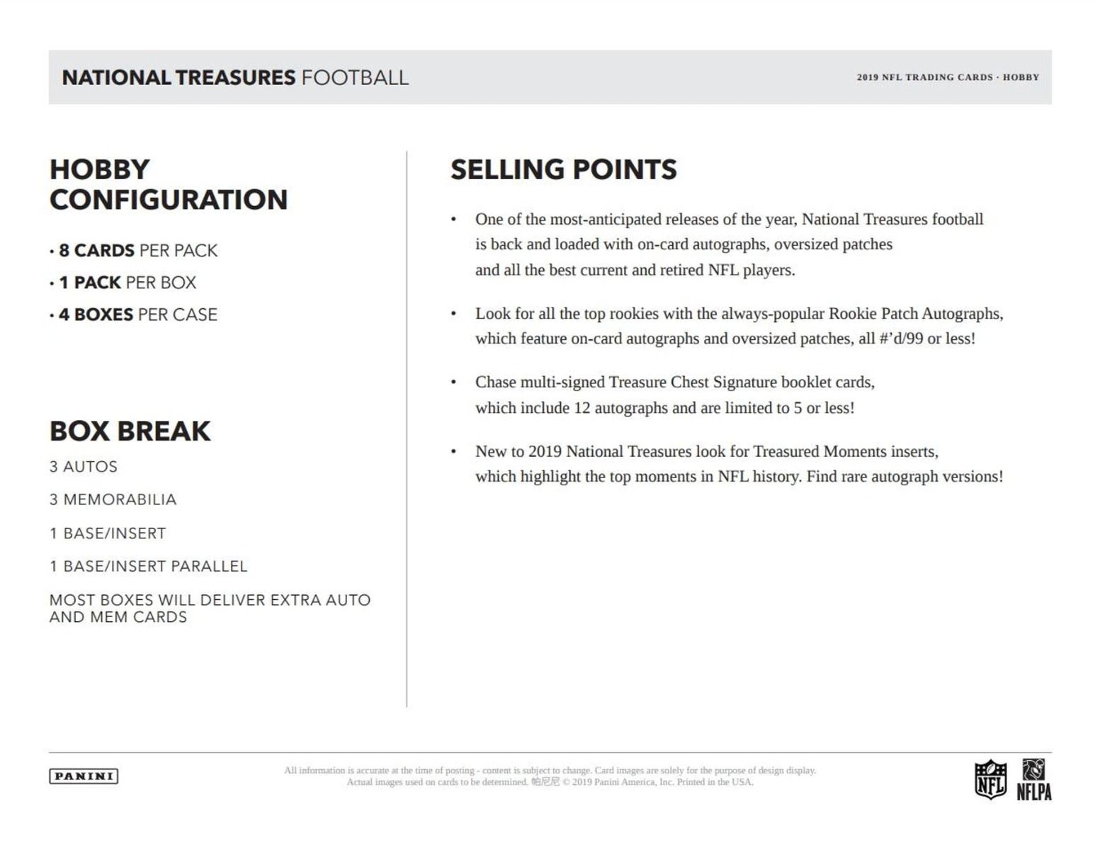 - New to 2019 National Treasures look for Treasured Moments inserts, which highlight the top moments in NFL history. Find rare autograph versions!