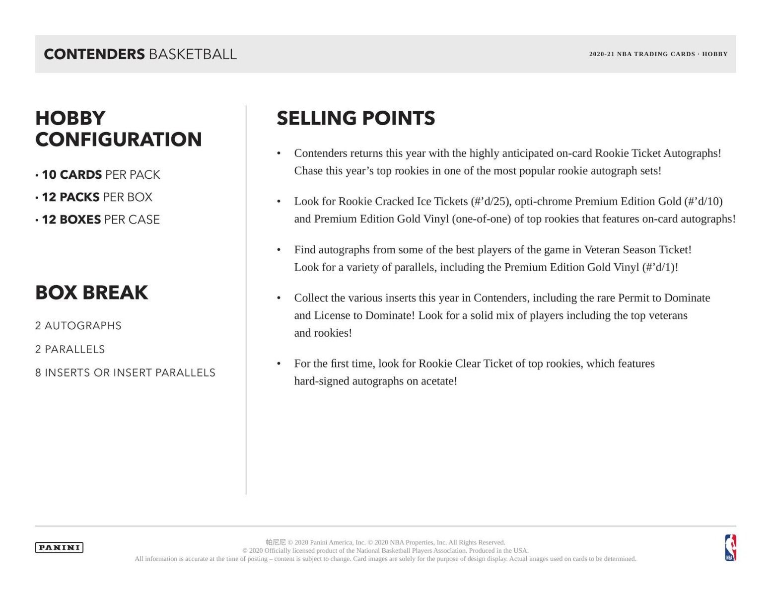 - Every Box of 2020/21 Contenders Basketball contains Two Autographs, Two Parallels, and Eight Inserts or Insert Parallels!