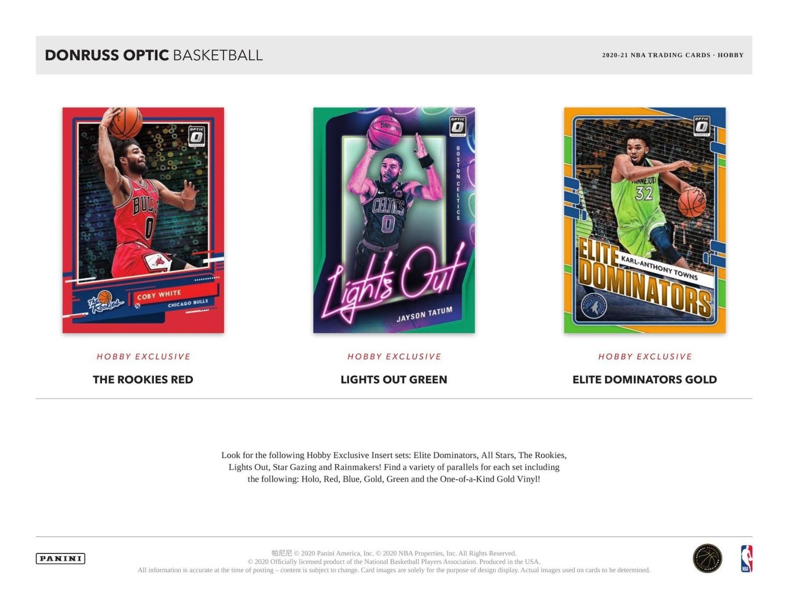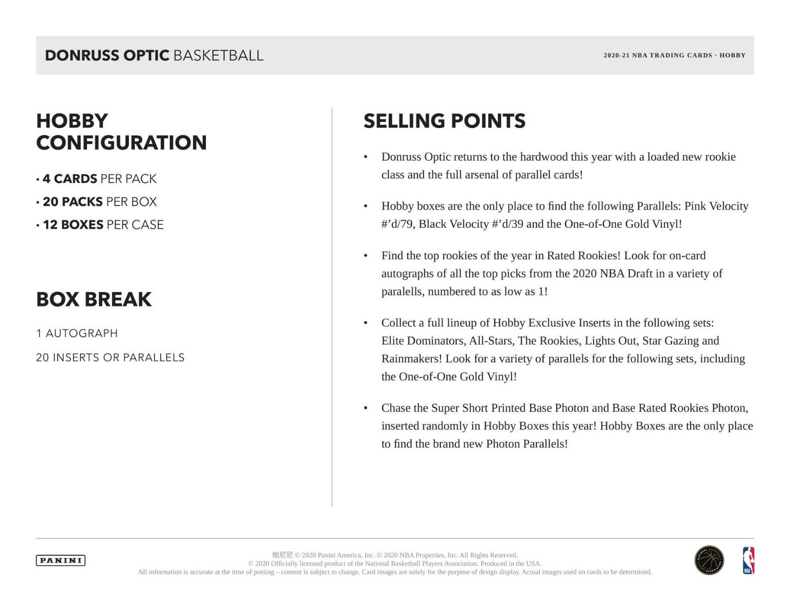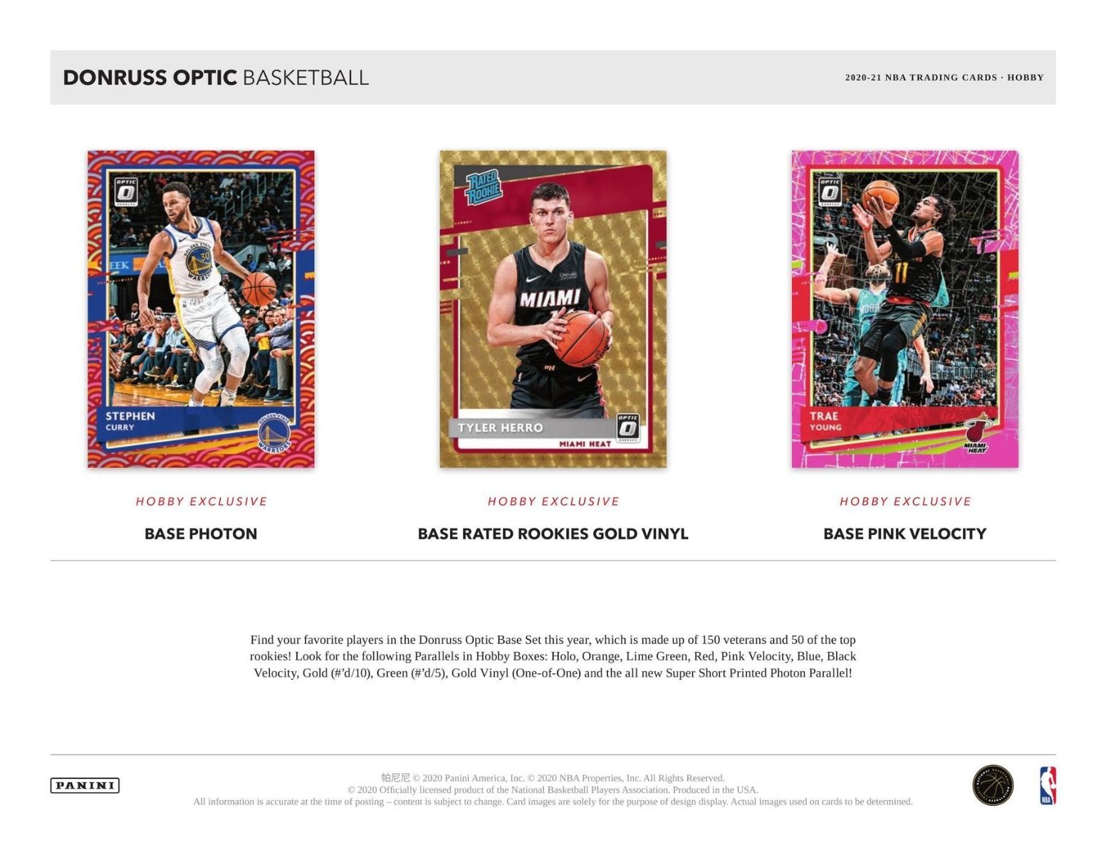 RATED ROOKIES SIGNATURES:Â Donruss Optic is back with the on-card Rated Rookie Signatures featuring the top rookies of the 2020 NBA Draft! Look for the following Hobby Exclusive Parallels: Holo, Blue (#'d/49), Gold (#'d/10), Green (#'d/5) and Gold Vinyl (One-of-One)!