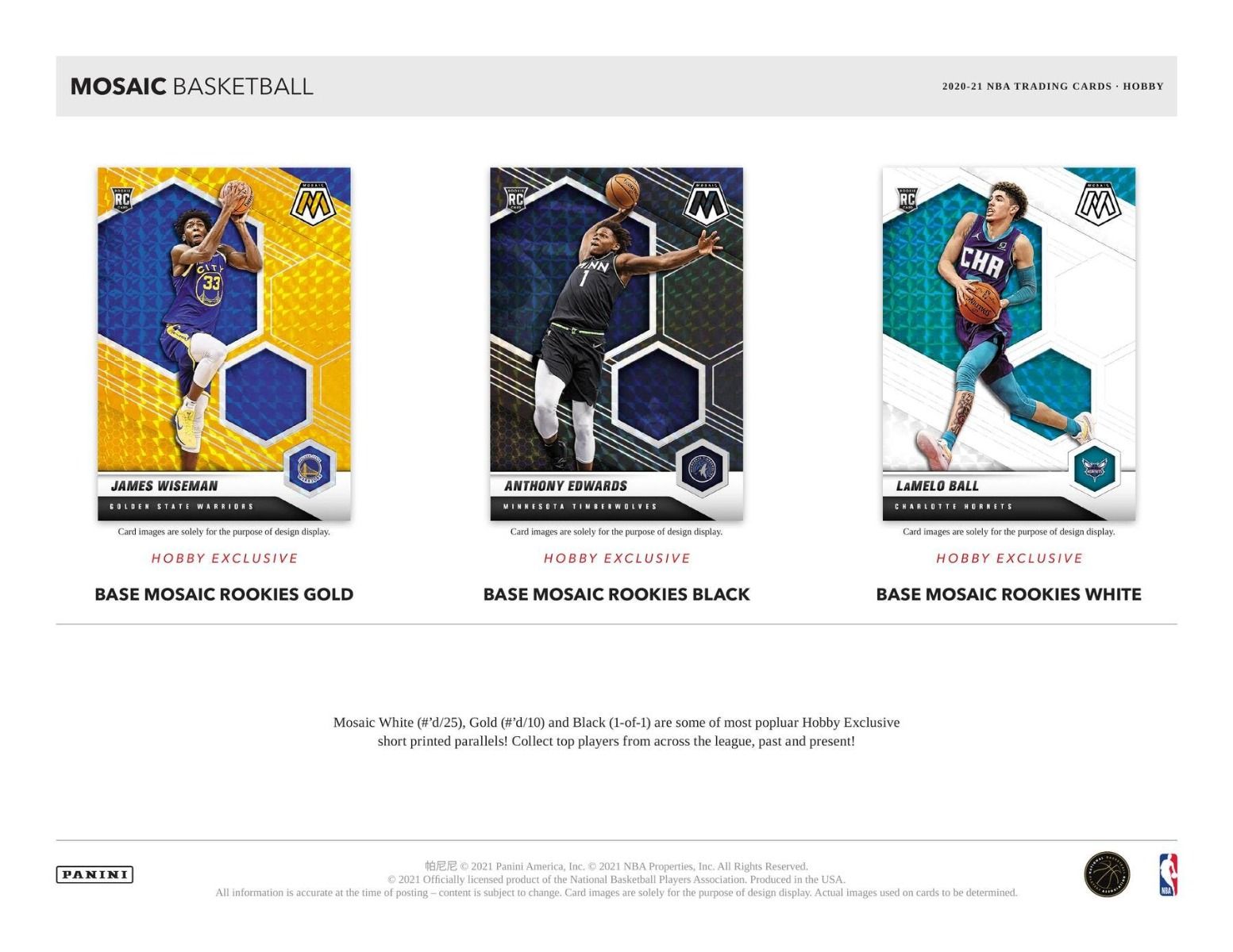 BASE MOSAIC ROOKIES:Â Mosaic White (#'d/25), Gold (#'d/10) and Black (1-of-1) are some of most popular Hobby Exclusive short printed parallels! Collect top players from across the league, past and present!