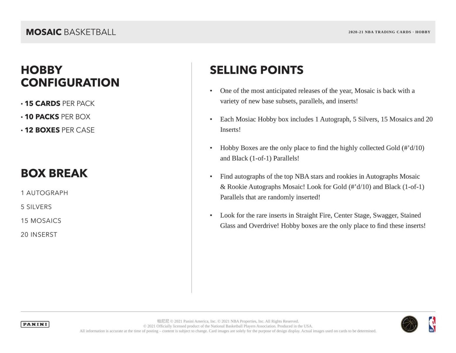 - Each Mosaic Hobby box includes 1 Autograph, 5 Silvers, 15 Mosaics and 20 Inserts!