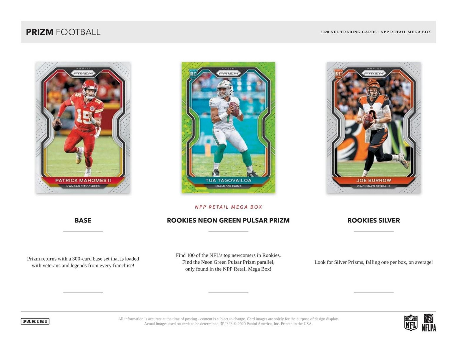 - Featuring: Rookie Cards of Joe Burrow, Tua Tagovailoa, Justin Herbert, Clyde Edwards-Helaire, Jerry Jeudy, CeeDee Lamb, Jalen Hurts, Clyde Edwards-Helaire, Jacob Eason, Henry Ruggs III, Justin Jefferson, Laviska Shenault Jr., Jonathan Taylor, J.K. Dobbins, Zack Moss, Brandon Aiyuk, Chase Young, Isaiah Simmons, Cole Kmet, Jordan Love, and Chase Claypool.