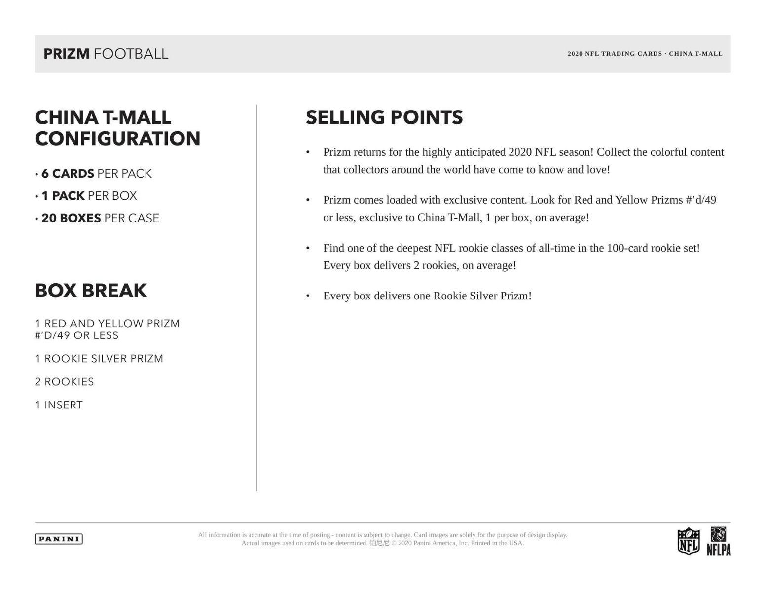 - Prizm comes loaded with exclusive content. Look for Red and Yellow Prizms #'d/49 or less, exclusive to China T-Mall, 1 per box, on average!