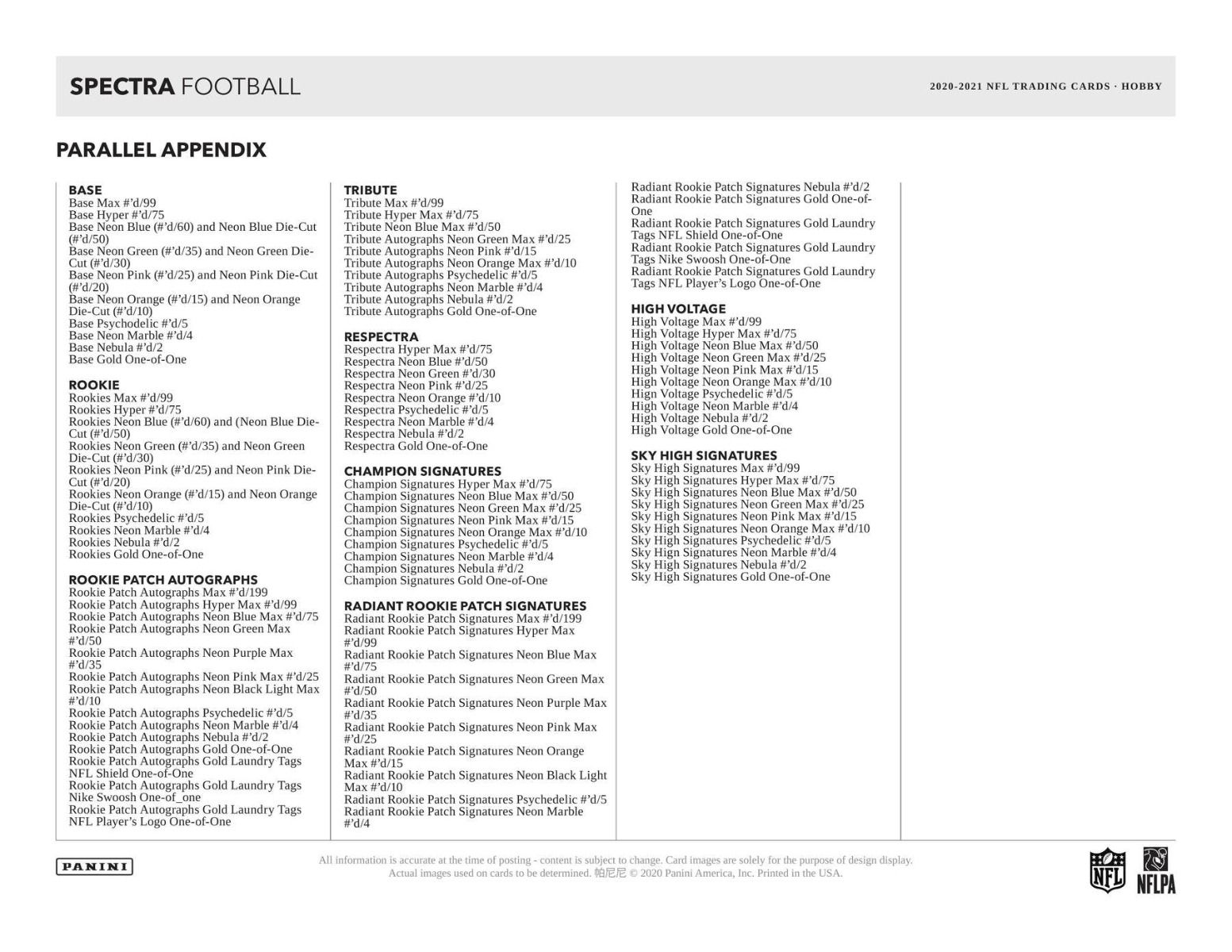 BASE:Â Chase a 135-card base checklist featuring the top stars in the NFL and look for a brand new parallel to Spectra this year, Hyper.