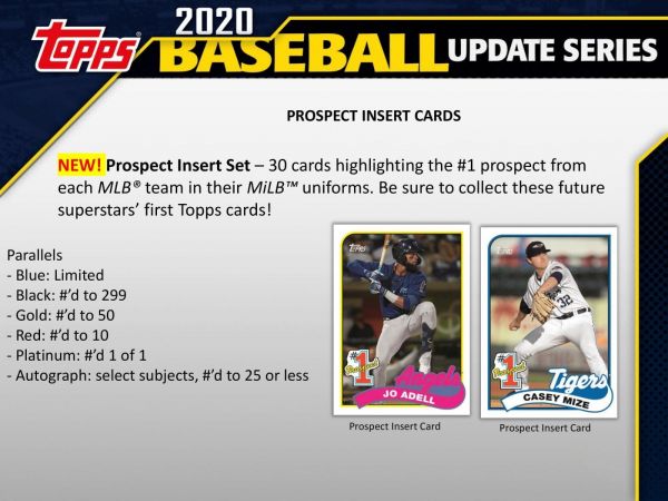 NEW! Prospect Insert Set - 30 cards highlighting the #1 prospect from each MLB team in their MiLB uniforms. Be sure to collect these future superstars' first Topps cards!