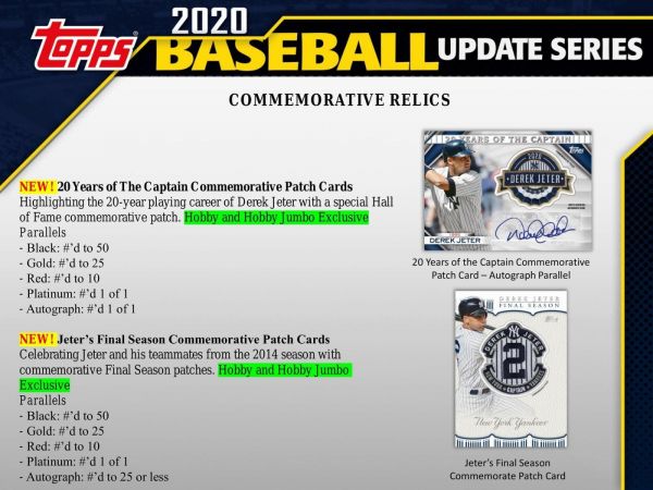 Highlighting the 20-year playing career of Derek Jeter with a special Hall of Fame commemorative patch. Hobby and Hobby Jumbo Exclusive