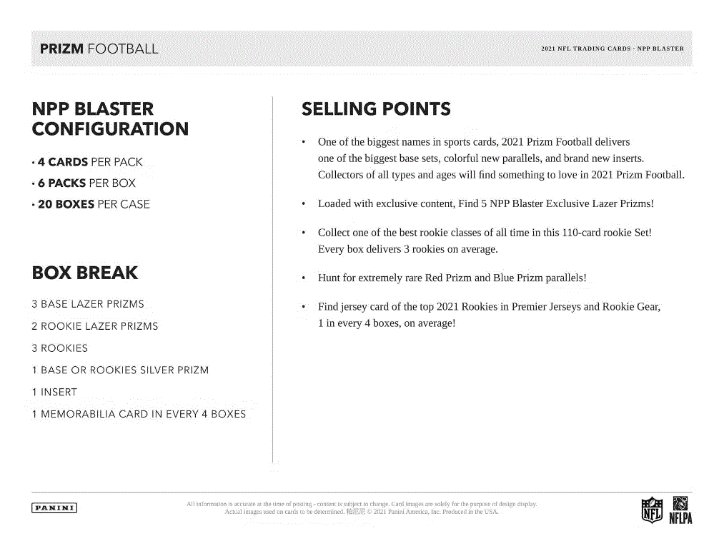 ROOKIES: Find 110 of the NFL's top newcomers in Rookies. Hunt for rare Blue Prizm and Red Prizm parallels, found only in blasters, and NPP blaster exclusive Lazer Prizm parallels! Find 5 Lazer Prizm parallels (3 Base, 2 Rookie) per box, on average!