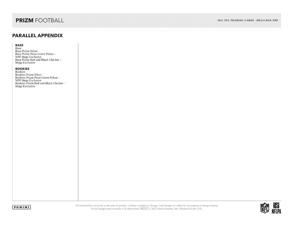 - One of the biggest names in sports cards, 2021 Prizm Football delivers one of the biggest base sets, colorful new parallels, and brand-new inserts. Collectors of all types and ages will find something to love in 2021 Prizm Football.