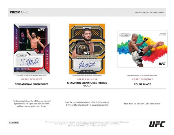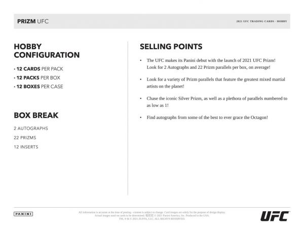 - The UFC makes its Panini debut with the launch of 2021 UFC Prizm! Look for 2 Autographs and 22 Prizm parallels per box, on average!