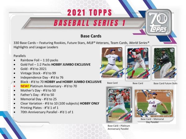 NEW! 70 Years of Topps Baseball:Â - A 70-card set celebrating the iconic designs of Topps Baseball cards from the past seventy years. This set will capture the game's greats from the past and present.