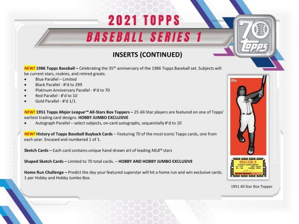 Home Run Challenge:Â - Predict the day your featured superstar will hit a home run and win exclusive cards. 1 per Hobby and Hobby Jumbo Box.