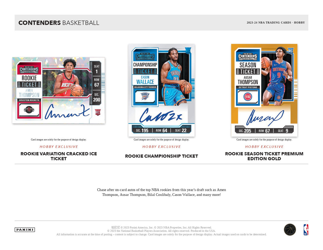 ROOKIE VARIATION CRACKED ICE TICKET / ROOKIE CHAMPIONSHIP TICKET / ROOKIE SEASON TICKET: Chase after on-card autos of the top NBA rookies from this year's draft such as Amen Thompson, Ausar Thompson, Bilal Coulibaly, Cason Wallace and many more!