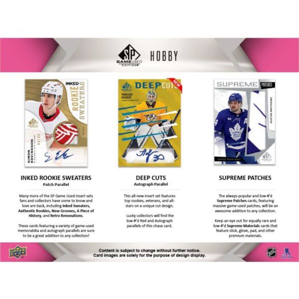 Many more of the SP Game Used insert set fans and collectors have come to know and love are back, including Inked Sweaters, Authentic Rookies, New Grooves, A Piece of History and Retro Renovations. These cards featuring a variety of game-used memorabilia and autograph parallels are sure to be a great addition to any collection!