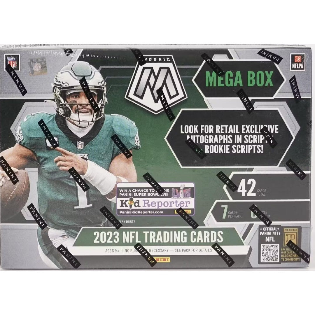 Panini presents the 2023 NFL Mosaic Football Trading Card Mega Box! Each box contains 6 packs with 7 cards. Look for Retail Exclusive Autographs in Scripts and Rookie Scripts. Look for Mega Box Exclusive Reactive Yellow Parallels! Collect them all!